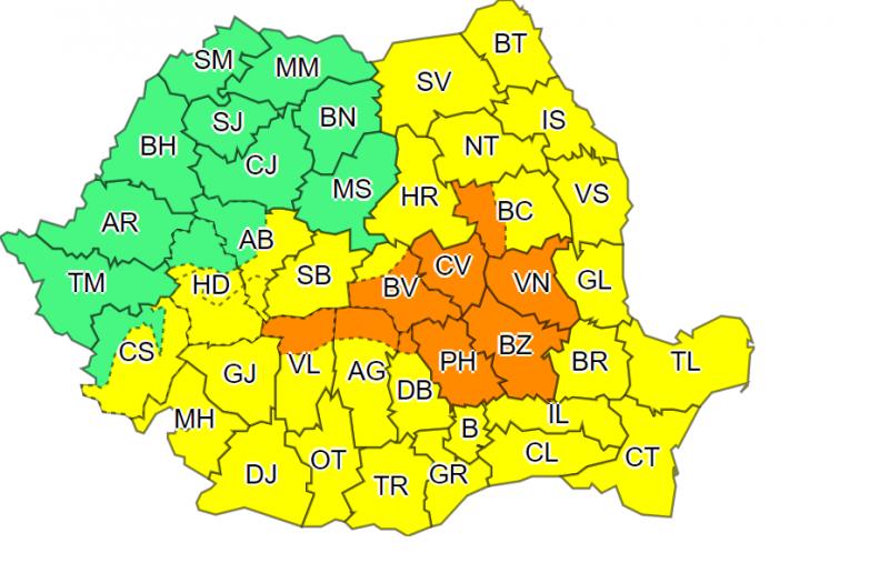 Totodata, miercuri, in intervalul 9.00 – 23.00, va fi cod portocaliu in judetele Prahova, Buzau, Vrancea, Covasna si in zona de deal si de munte a judetelor Dambovita, Arges, Valcea, Bacau si Brasov.