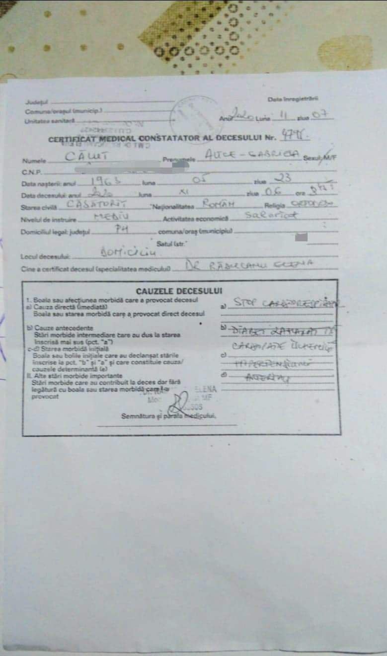 In acest sens s-a emis Certificatul Constatator de Deces cu cauzele sus mentionate, certificatul nr 4795 din 11.07.2020, certificat emis legal de dr Radulescu Elena.