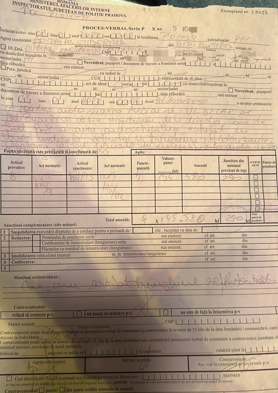 Din cate se poate observa pe procesul – verbal de contraventie, tanara „potcovita” stiind ca este hartuita si este un abuz grosloan (recunoscut si de „cocosel”) a mentionat in procesul verbal, un fel de haz de necaz „Nu am.Abia mi-am pus silicoane” si a refuzat sa semneze. Deci, tanara potcovita nu are procesul-verbal de contraventie (aceasta plecand in Germania) dar presupusa sa „rivala” il are de la „cocoselul” interlop si infractor Palas Cristinel Tiberius Marius de la Serviciului Rutier al I.J.P.Prahova (Biroul Rutier Ploieşti).