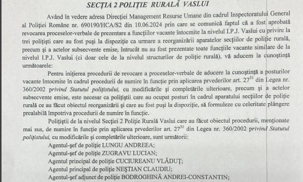 Ulterior, s-a aflat ca mai erau inca alti sase agenti, victime ale aceluiasi tip de conduita abuziva. (Vedeti in dovedire, in foto, adresa SRU din IPJ Vaslui nr. 73862/17.06.2024)