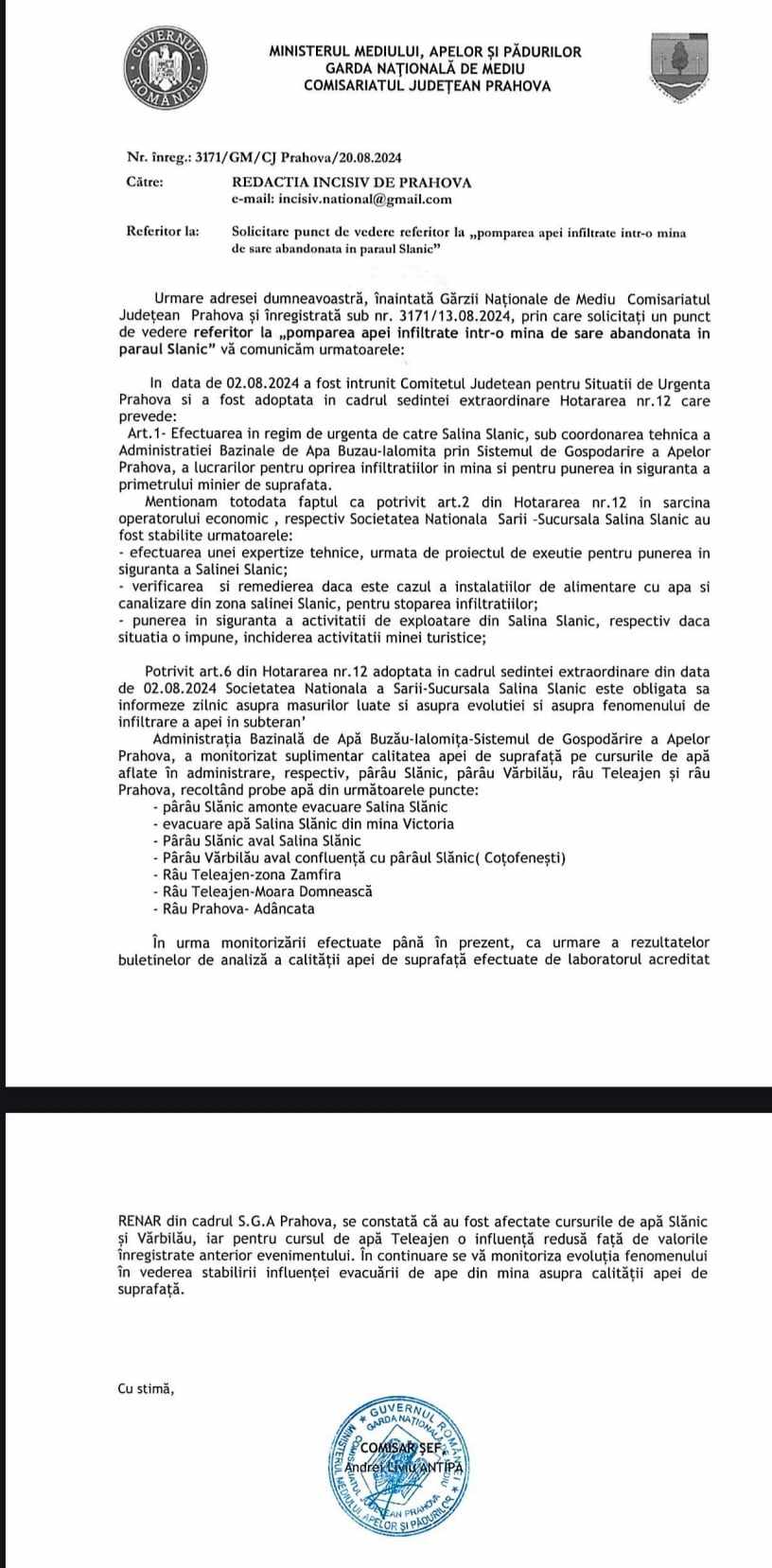 Având în vedere impactul semnificativ al recentului incident ecologic asupra siguranței naționale, conform Strategiei de Securitate Națională adoptate de Consiliul Suprem de Apărare a Țării (CSAT), ziarul Incisiv de Prahova a solicitat în mod formal o informare din partea mai multor instituții. Printre acestea se numără Consiliul Suprem de Apărare a Țării, Ministerul Afacerilor Interne, Garda Națională de Mediu, Inspectoratul pentru Situații de Urgență „Șerban Cantacuzino” din Județul Prahova, Garda de Mediu Prahova și Inspectoratul de Poliție Județean Prahova. Cererea se axează pe dezvăluirea măsurilor adoptate pentru a aborda criza și identificarea responsabililor care trebuie trași la răspundere pentru dezastrul ecologic.