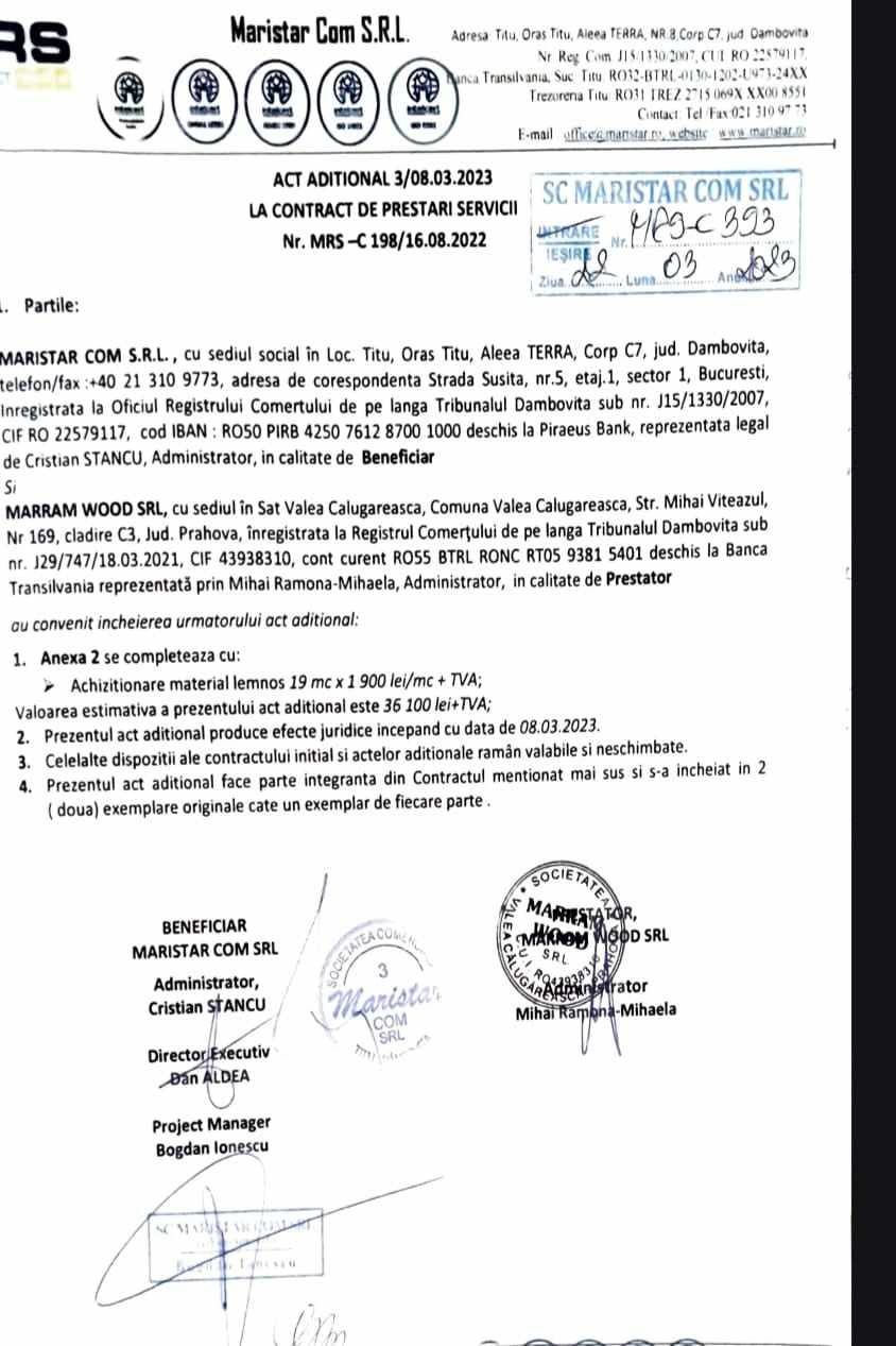În acest context, prezentăm azi doar actul adițional nr. 3 din 08.03.2023, care include semnătura lui Baciu Marian, în calitate de polițist, în condiții suspecte, fără a avea legitimitatea necesară. De altfel, contractul inițial cu MRS – C 198/16.08.2022 a fost negociat și semnat tot de acest  polițist în funcție, nu de reprezentanții legali ai firmei afectate, ceea ce ridică mari semne de întrebare.